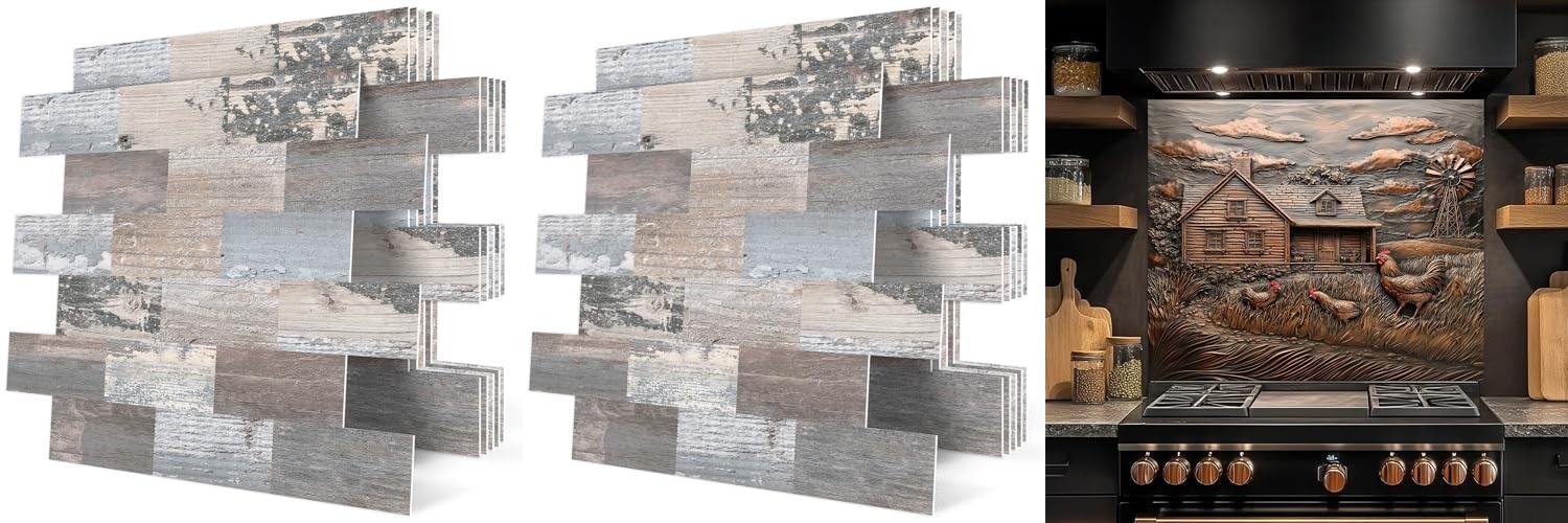 Transform your space with the DEWOO 20-Sheet Peel and Stick Rustic Backsplash Wall Tile. These tiles offer a charming faux wood look, bringing a farmhouse feel to your kitchen or any room. They are designed for easy application, making DIY projects a breeze.
