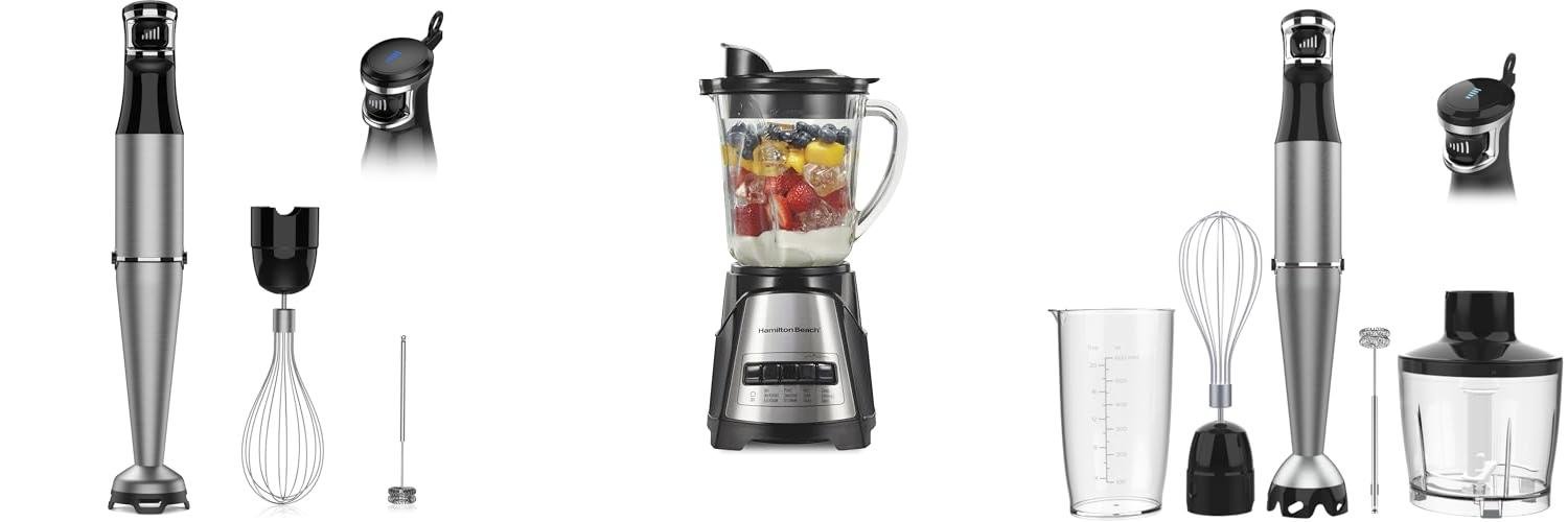 - It comes with everything you need. The box includes the hand blender, blender arm, blending jar, and pan guard.