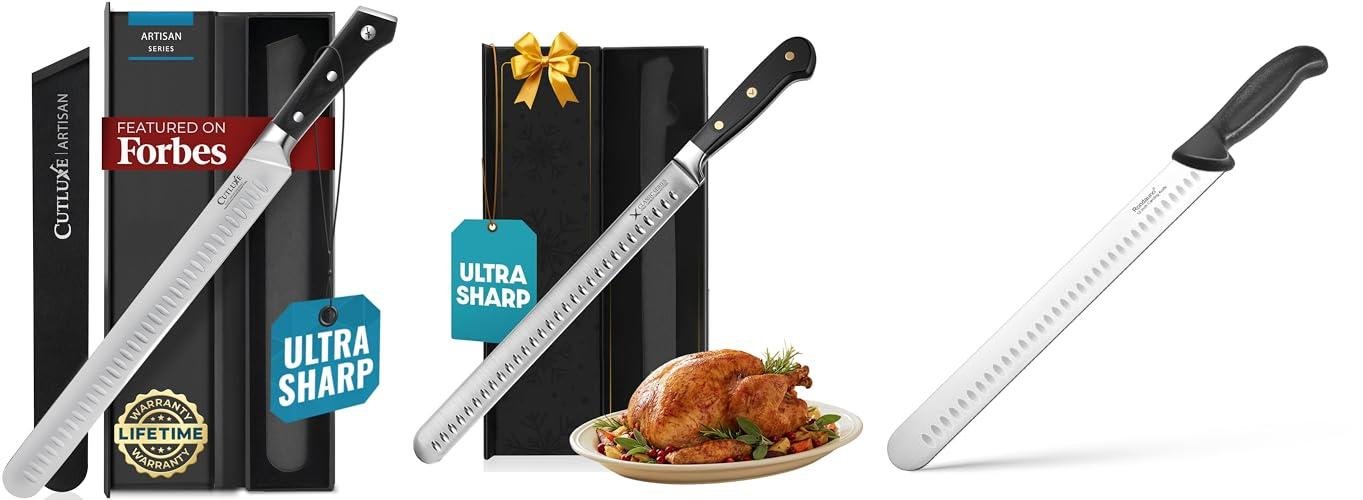 - Blade Shape: Look for a blade that is relatively straight with a gentle curve towards the tip. This shape helps you control your slicing. Some knives have a Granton edge, which are those little hollows on the side. These help prevent the meat from sticking to the blade.