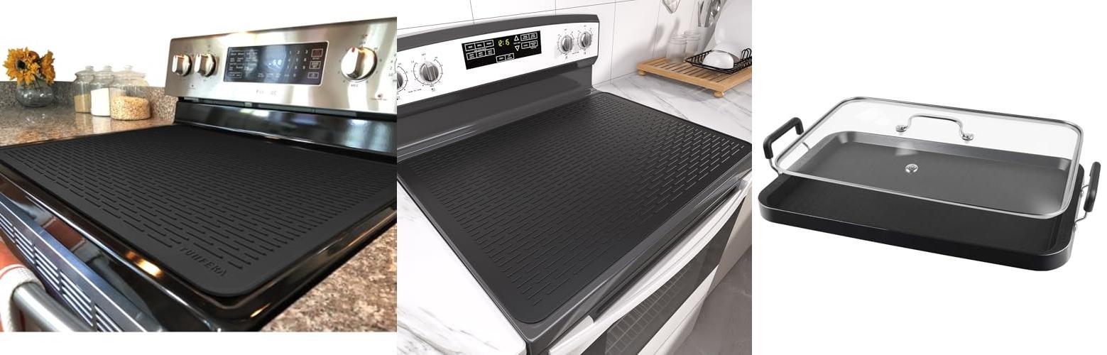 The YUHFERA Silicone Top Cover for Electric Stove is a versatile kitchen helper. This extra-large mat protects your glass-top stove, counters, and even your washer-dryer from messes. It also works as a drying mat and a trivet for hot dishes.
