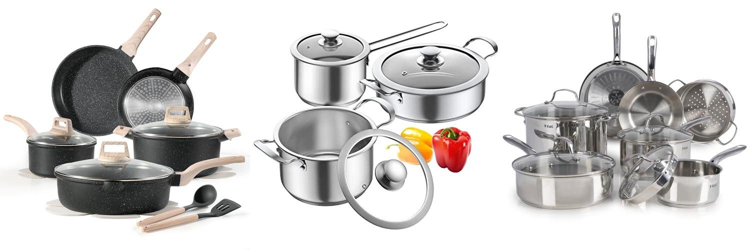 - The pots and pans are made with high-quality, 3-ply stainless steel and an aluminum core. This means they heat up fast and evenly, making your cooking more consistent.