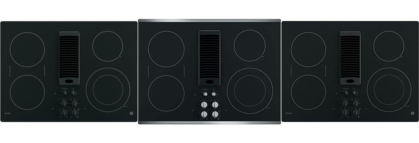 2. GE Profile Series 30″ Downdraft Electric Cooktop Black Glass with Stainless Steel Trim PP9830SJSS