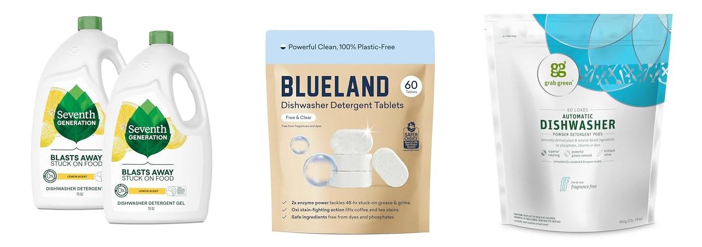 Green dishwasher detergents get their cleaning power from natural and less harmful ingredients. You’ll often find: