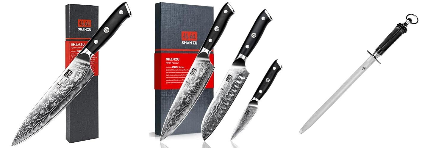 Elevate your kitchen experience with the SHAN ZU Damascus Knife Set. This 3-piece collection features ultra-sharp chef’s knives crafted from genuine Japanese super steel. They promise precision and durability for all your culinary tasks.