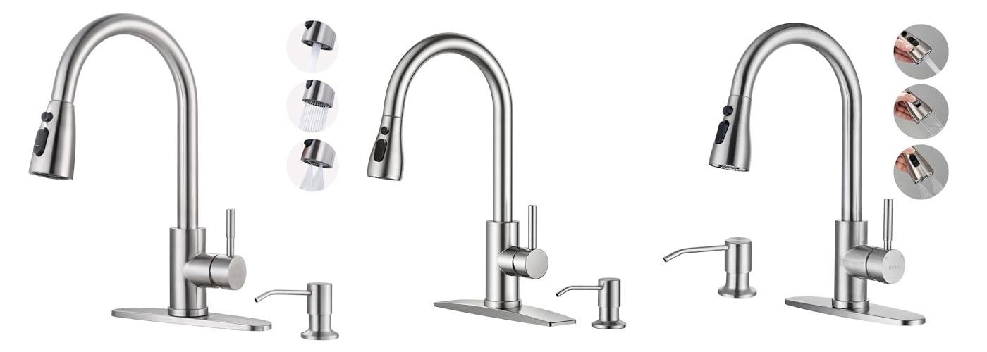 1. WOWOW Kitchen Faucet with Soap Dispenser: 304 Stainless Steel Kitchen Sink Faucet with Pull Down Sprayer 3 Modes