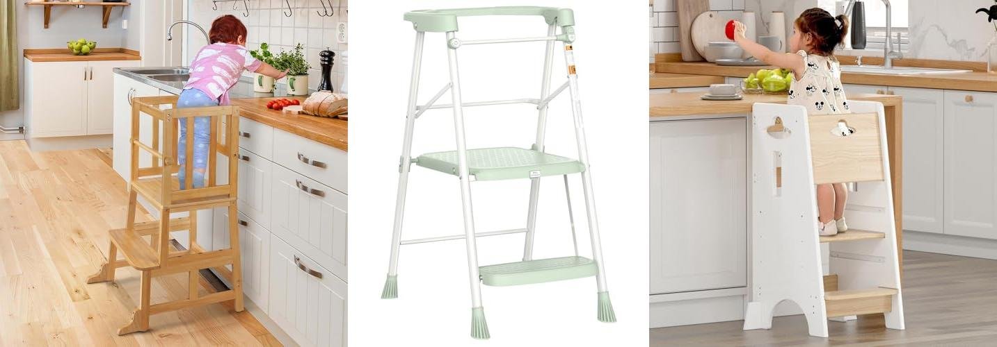 A: A kitchen helper stool safely lifts children so they can reach countertops and sinks. It lets them participate in kitchen activities.