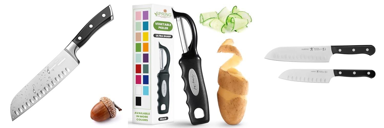 A: A chef’s knife has a curved blade for rocking motions. A santoku knife has a straighter blade with a rounded tip, good for chopping and slicing.