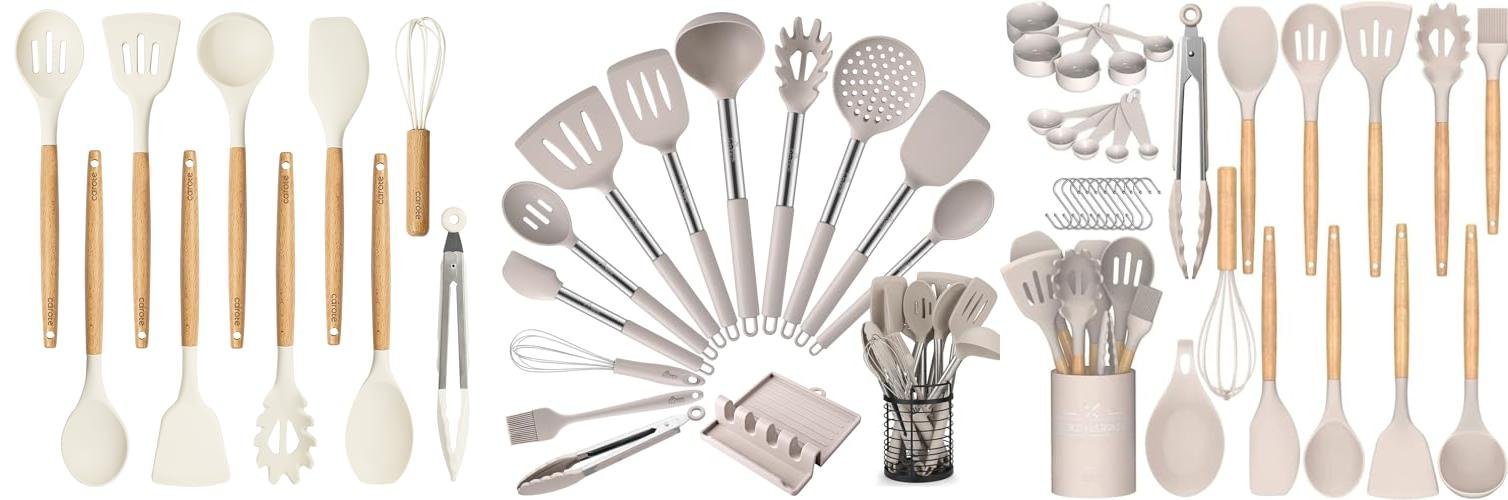 A: You can find sets made of silicone, bamboo, stainless steel with silicone grips, or a mix of these materials.