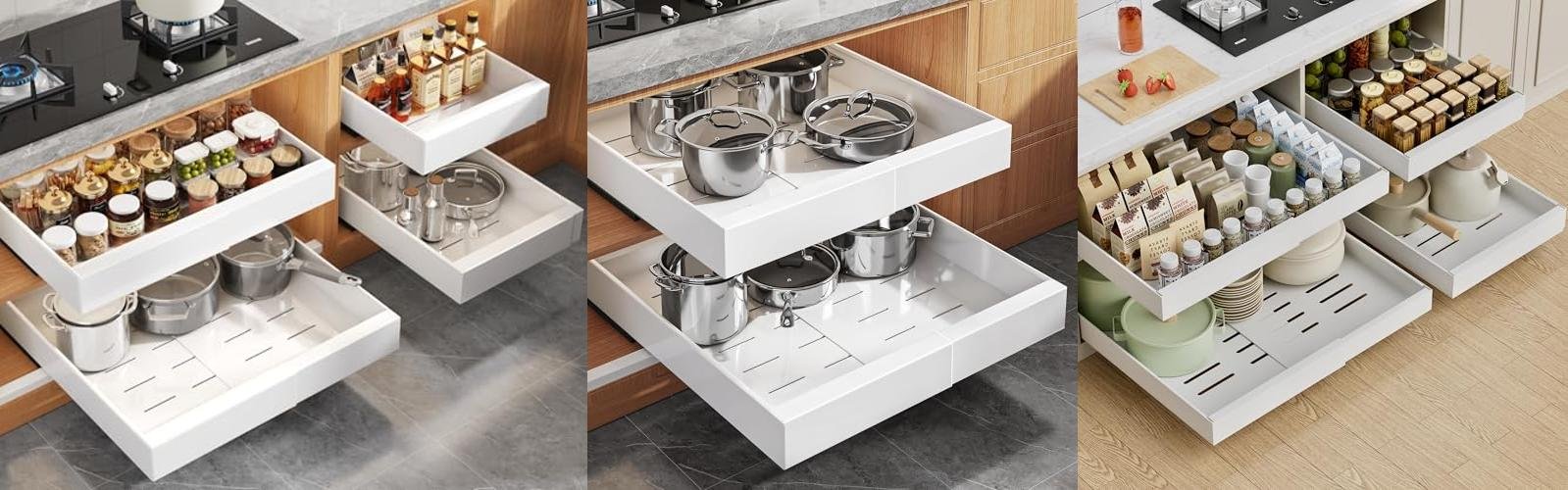 A: They make it easy to access everything stored in your cabinets, prevent wasted space at the back, and keep items neatly arranged and visible.