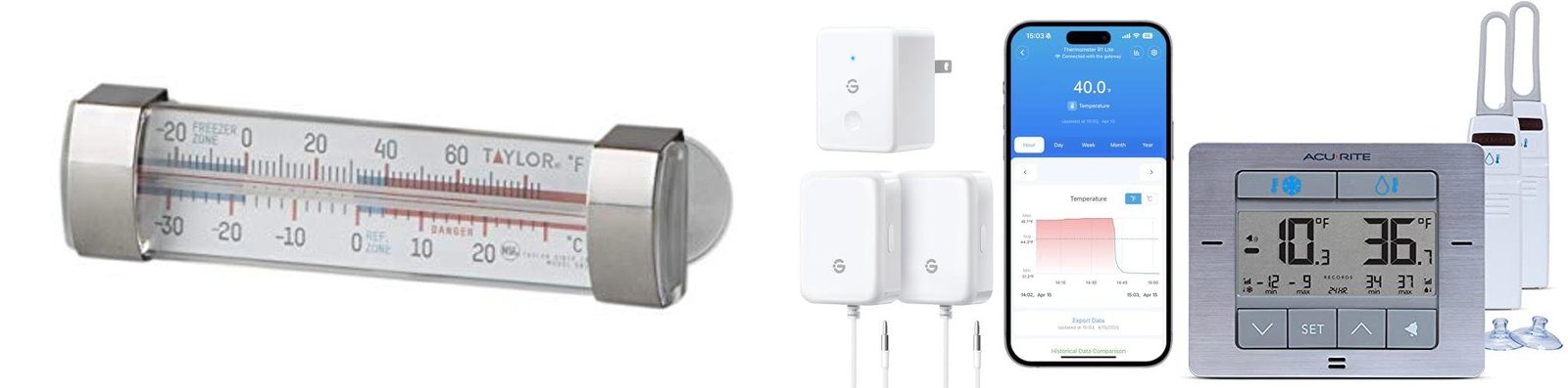 • It includes two digital thermometers, one for your fridge and one for your freezer. They send readings to a main display.