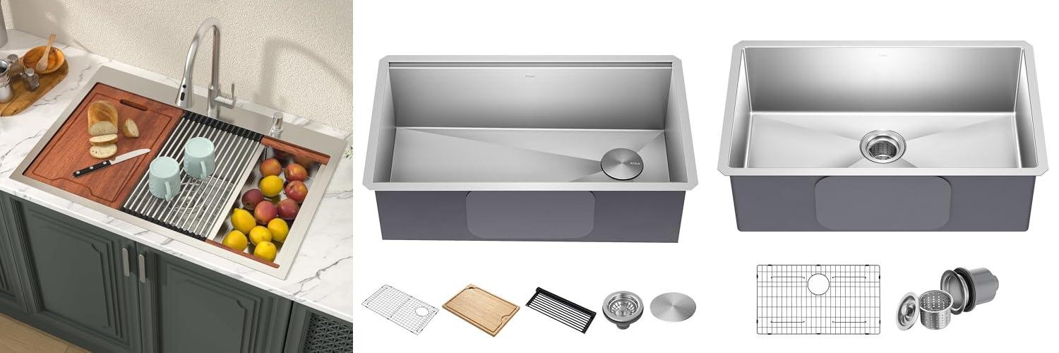 Transform your kitchen with the KRAUS Kore 32-Inch Undermount Workstation Sink. This sink is designed to make your kitchen tasks easier and keep your countertops clean. It’s a single bowl sink made from tough stainless steel, and it comes with helpful accessories.