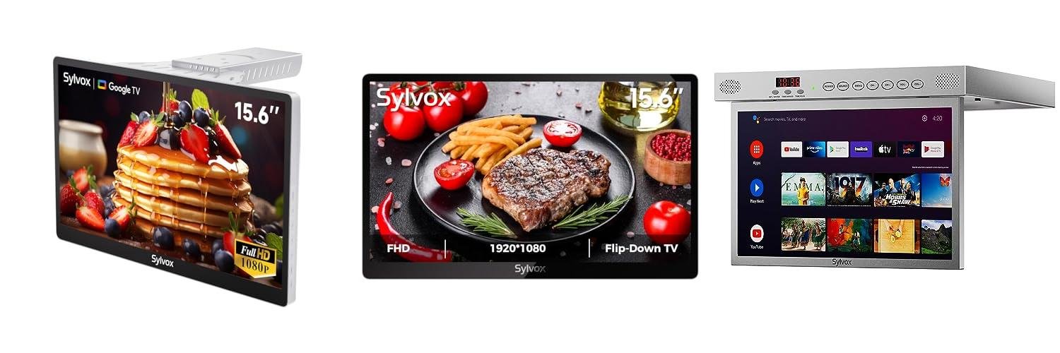 2. SYLVOX 15.6″ Flip-Down TV for Under Cabinet